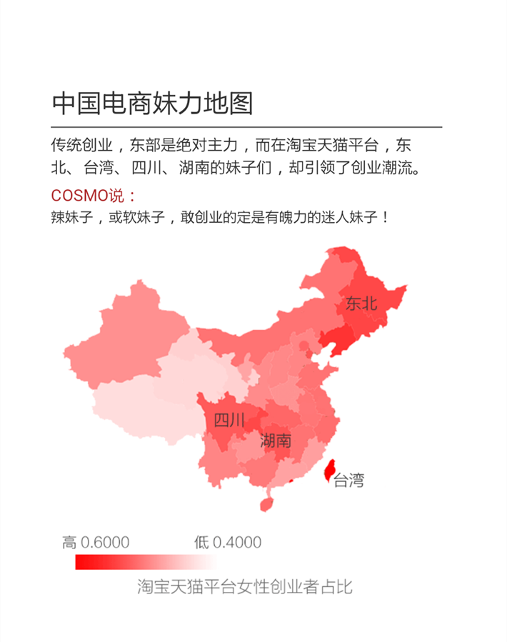 值此全球女性创业大会举办之际,天猫携手时尚COSMO,为大家奉上最原生,最生动的女性创业报告《中国电商妹力指数》,想知道哪里的妹子们最能创造从1万到5亿的传说?大淘宝创业的妹子们平均年龄几何?
